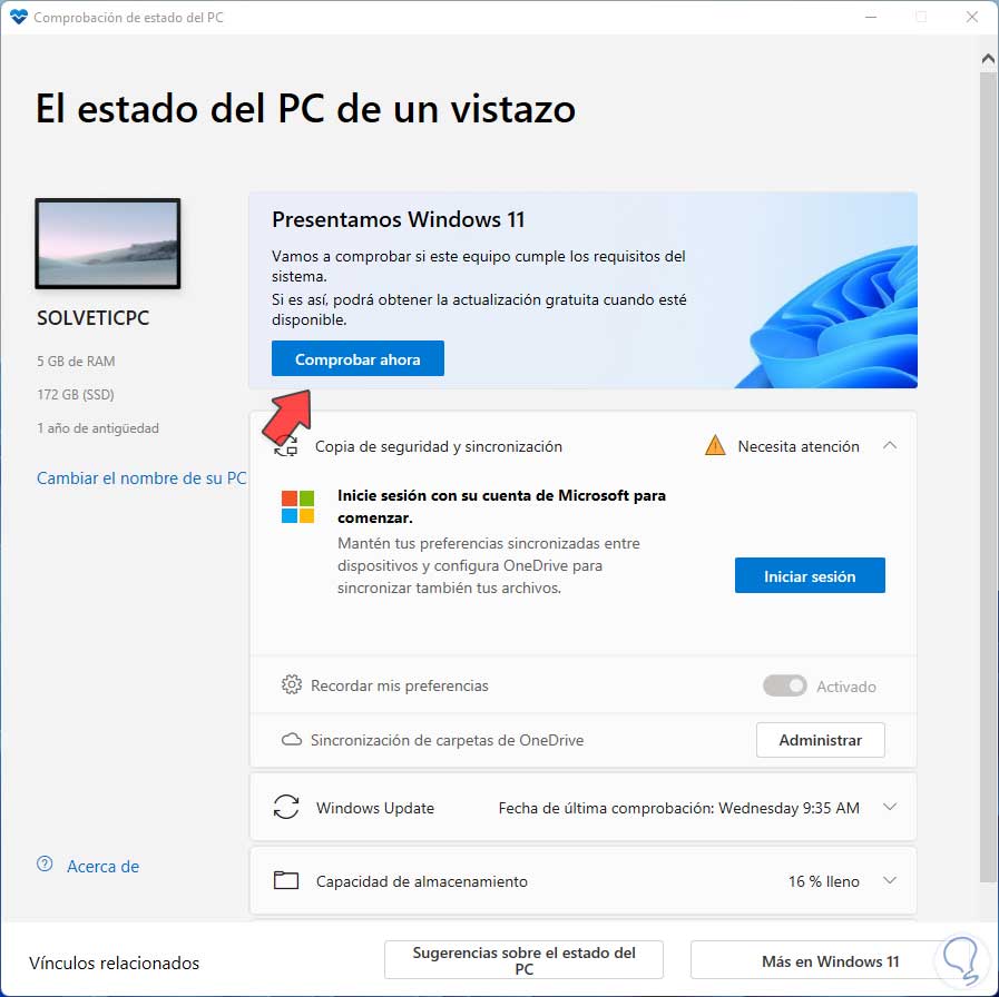 y al lanzarse la utilidad veremos lo siguiente. Damos clic en "Comprobar ahora" para verificar que se cumplen con los requisitos para Windows 11: