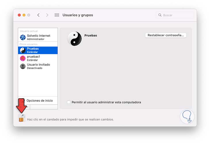 Damos clic en el icono de candado e ingresamos la contraseña de administrador para editar los usuarios, ahora seleccionamos el usuario a borrar:
