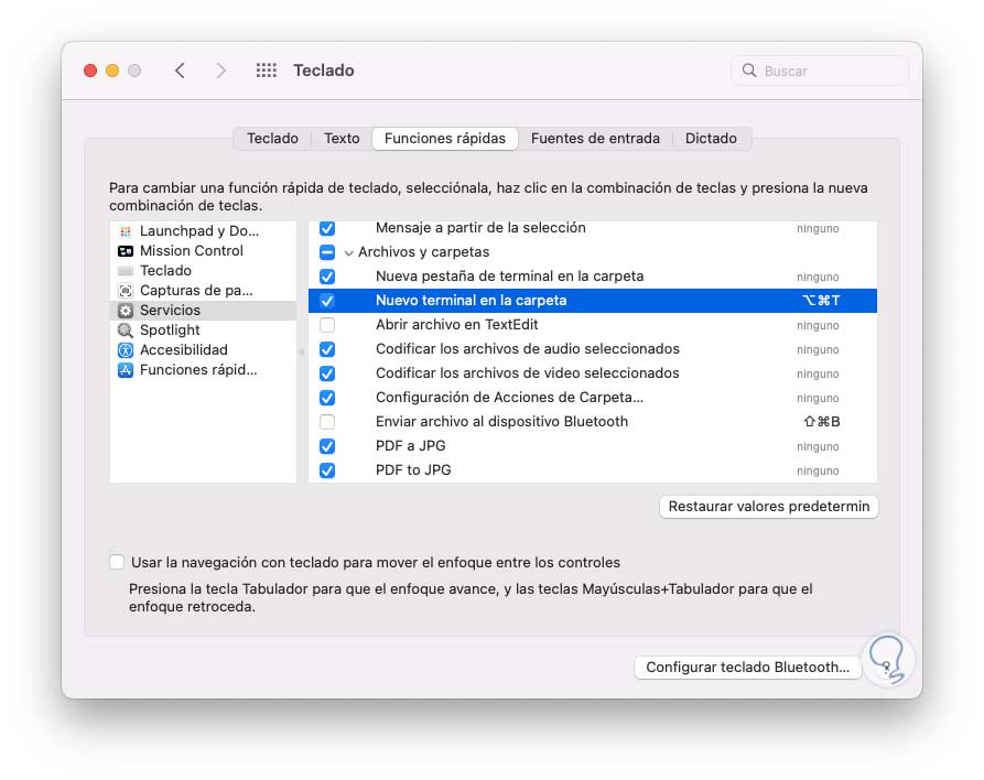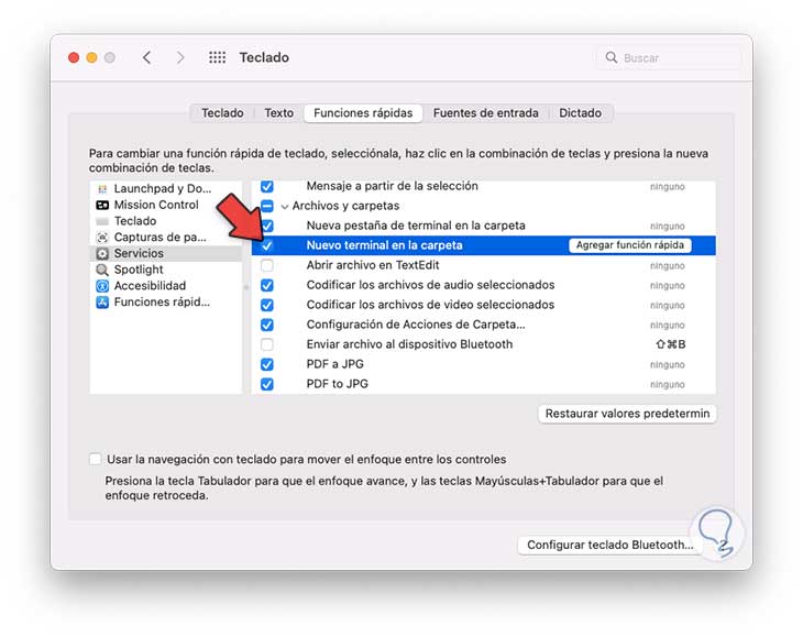 Damos clic en "Teclado" y en la pestaña "Funciones rápidas" vamos a "Servicios", allí ubicamos el servicio llamado "Nueva terminal en la carpeta":