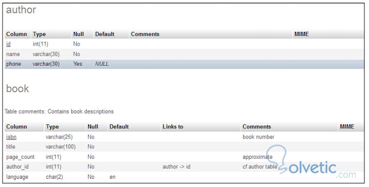 Si queremos generar el diccionario de datos, tenemos la opción desde la misma página de estructura pero de la base de datos, para ello hacemos click en el link de Data Dictionary, ahí tendremos el detalle de cada tabla de nuestra base de datos, veamos un ejemplo parcial de cómo se vería.