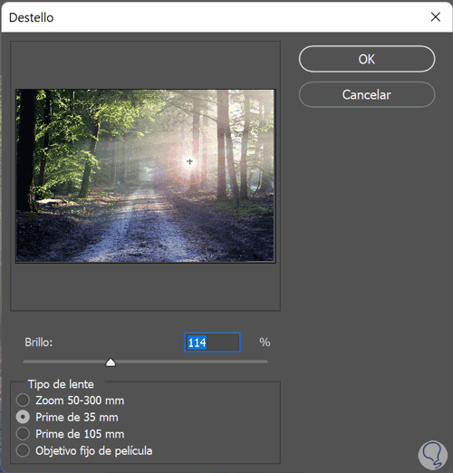 Aquí configuraremos el destello de luz en función del Brillo y del Tipo de lente que queramos simular. Además pulsa sobre la ventana de previsualización para mover y colocar el punto principal del destello.
