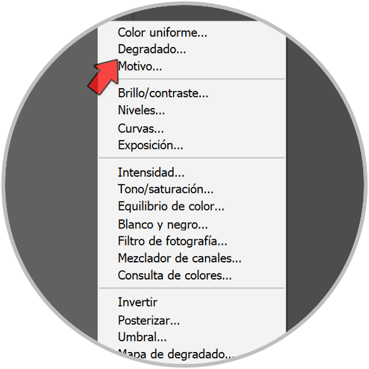 Podrías usar diferentes capas de ajuste para darle color a nuestro destello de luz pero en este caso vamos a usar la capa de “Degradado” Para ello vamos a crear una nueva capa de ajuste de “Degradado”.
