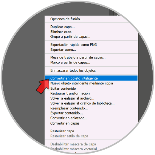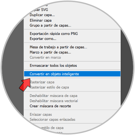 Lo siguiente será desenfocar esta nueva capa. Para ello primero vamos a convertir nuestra nueva capa en objeto inteligente ya que así después podremos editar el filtro que vamos a poner. Para esto haz clic sobre la capa creada y elige “Convertir en objeto inteligente”.