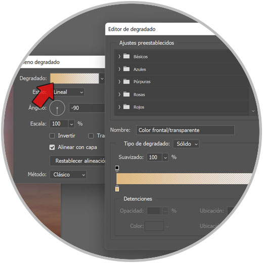 El color que te cogerá para el degradado será el que tengas como color frontal por defecto en ese momento. Para editar el color del degradado haz doble clic en “Degradado” y configura aquí las opciones de ese estilo incluido el color:
