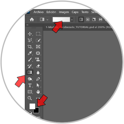 Le vamos a aplicar color ahora a esta luz. Para esto pon el color blanco como frontal y elige la herramienta “Degradado” del panel de herramientas. Selecciona el estilo que empieza en blanco y después de difumina: