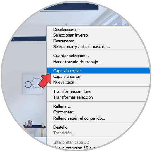 Hacemos ahora clic derecho sobre la selección hecha y elegimos la opción que dice “Capa vía copiar”. De esta forma se creará una capa con nuestra selección de imagen.