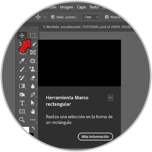 Lo siguiente será ir al panel de herramientas y elegir “Herramienta Marco rectangular”.