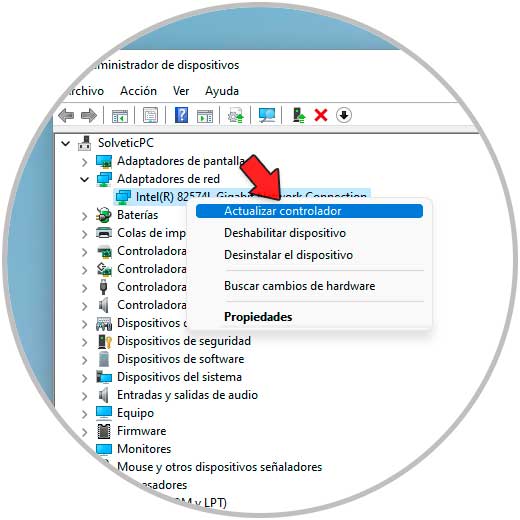En "Adaptadores de red" damos clic derecho sobre el controlador y seleccionamos "Actualizar controlador":