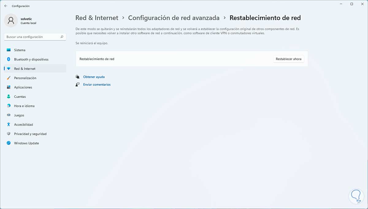 En "Restablecimiento de red" damos clic en "Restablecer ahora":