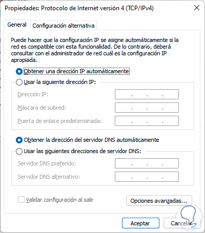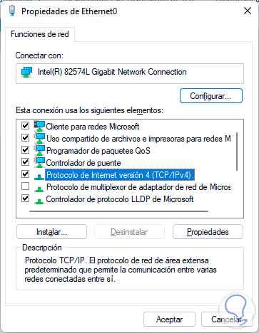 Seleccionamos "Protocolo de Internet versión 4" y luego damos clic en "Propiedades", se abrirá lo siguiente: