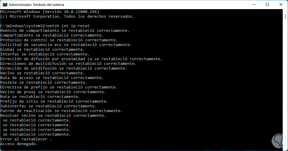 Podemos ver que este comando restablece numerosos aspectos de la IP para permitir que su uso sea normal nuevamente, después de esto validamos el acceso a Internet: