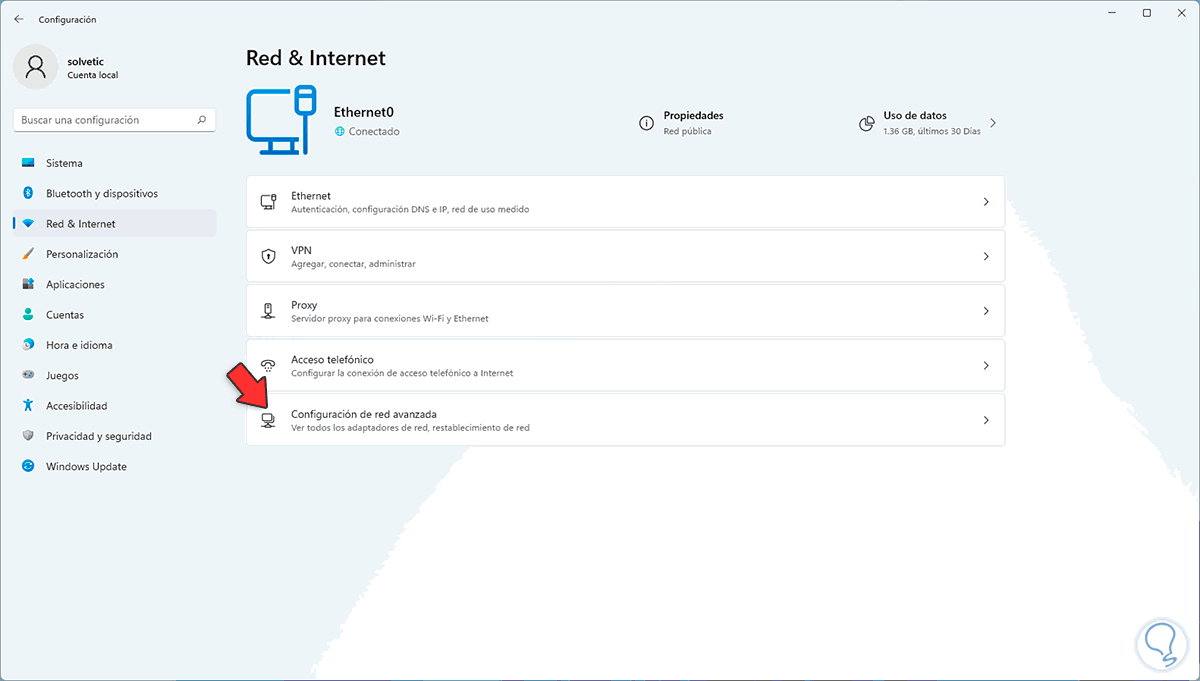 Para restablecer el adaptador de red vamos a "Inicio - Configuración - Red e Internet - Configuración de red avanzada":