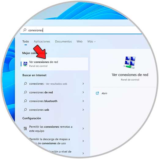 Para ello en el buscador de Inicio ingresamos "conexiones" y damos clic en "Ver conexiones de red":