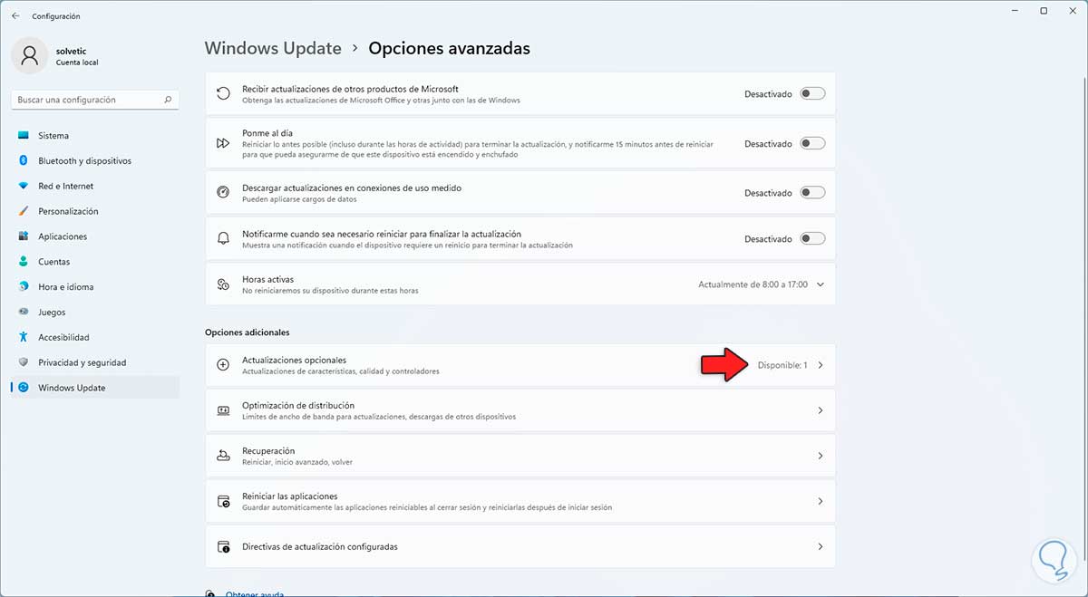 Para este proceso vamos a "Inicio - Configuración -Windows Update - Opciones avanzadas":