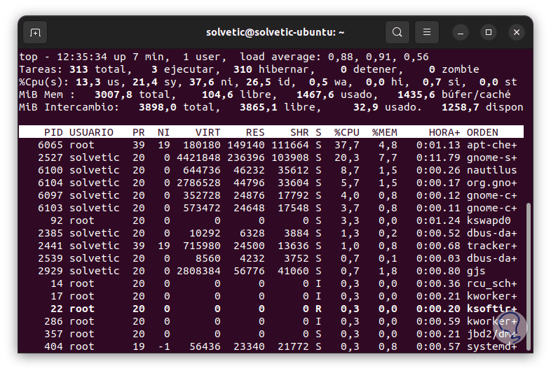 Abrimos la terminal y ejecutamos "top" para listar procesos con su consumo de CPU: