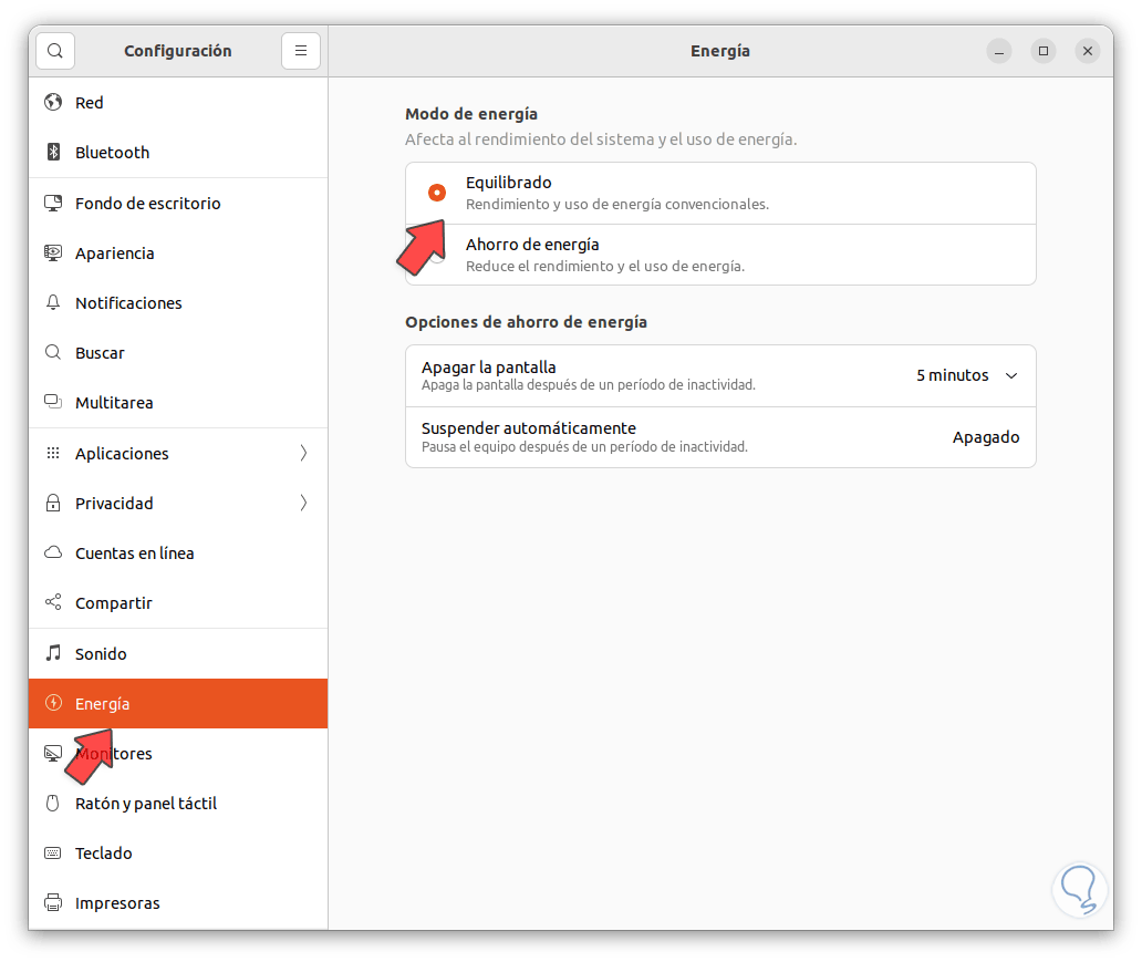 La energía en Linux puede ayudar a optimizar el uso general del sistema pero al mismo tiempo tener un impacto en el CPU debido a las tareas en segundo plano que son ejecutadas, para comprobar esto abrimos Configuración: