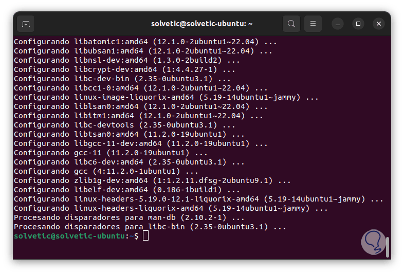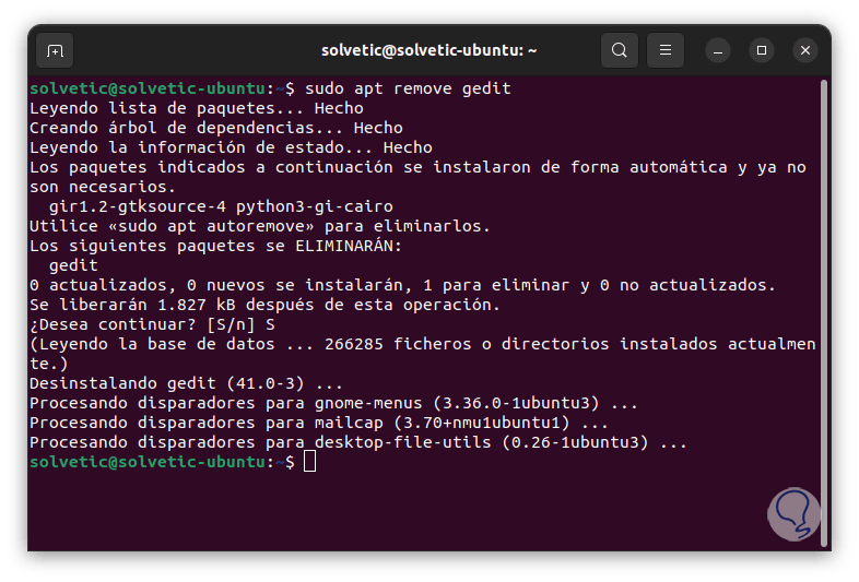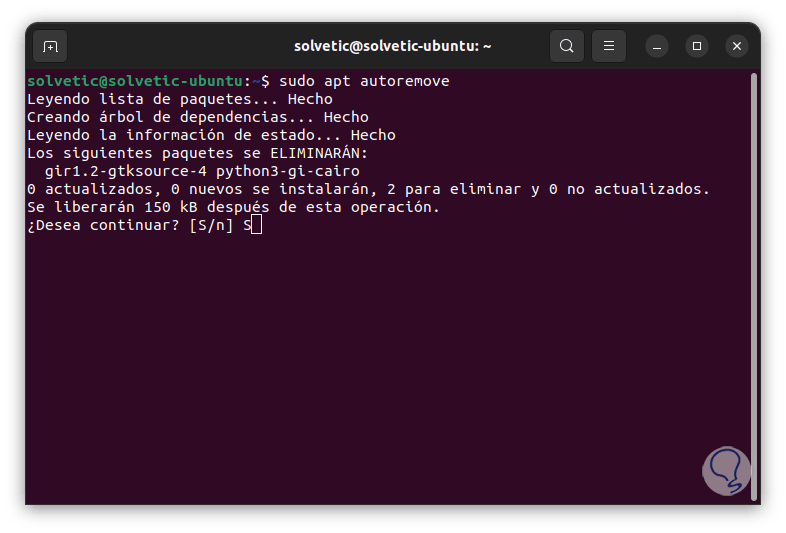 Confirma el proceso ingresando la letra S y espera que finalice: