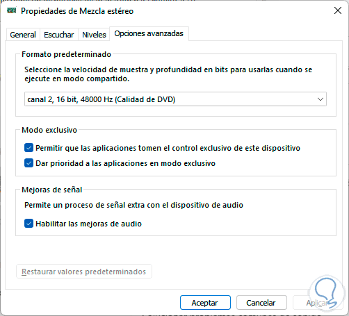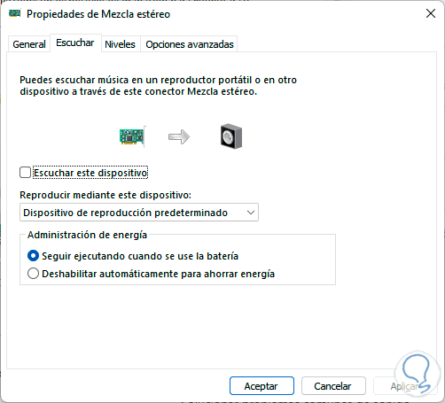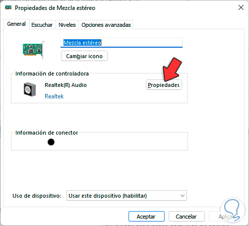 Seleccionamos "Mezcla estéreo" y damos clic en "Propiedades", allí disponemos de algunas opciones como: