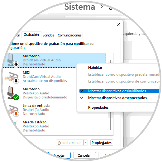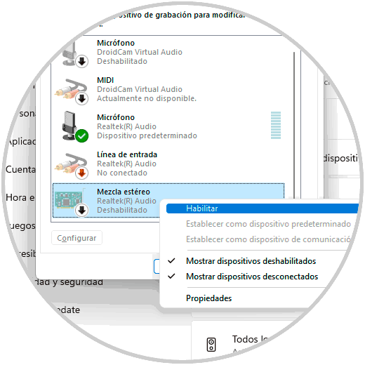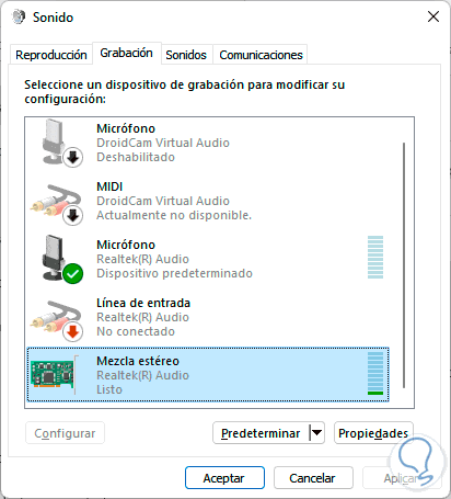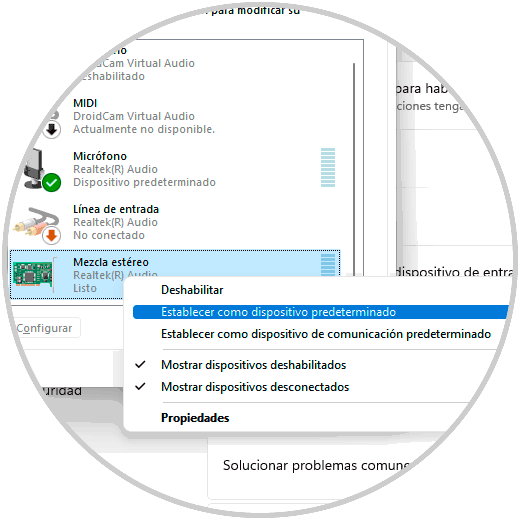 Al dar clic derecho sobre mezcla estéreo disponemos de algunas opciones como lo son: