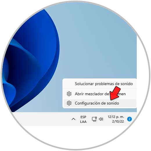 Para esto daremos clic derecho en el icono de volumen en la barra de tareas y luego damos clic en la opción "Configuración de sonido":