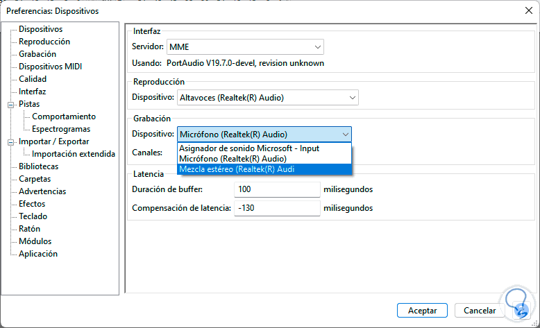 Luego en la sección de grabación elegimos la mezcla estéreo: