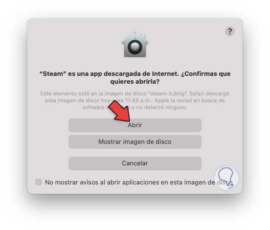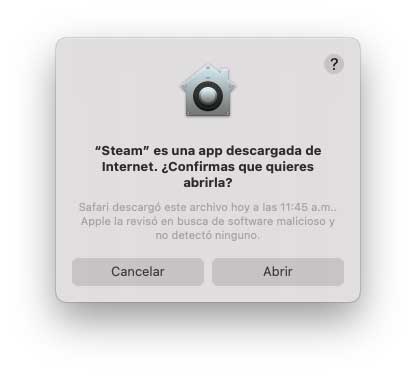 Arrastramos el icono de Steam a Aplicaciones, ahora damos doble clic sobre Steam para iniciar la instalación en macOS, se abrirá la siguiente ventana de seguridad: