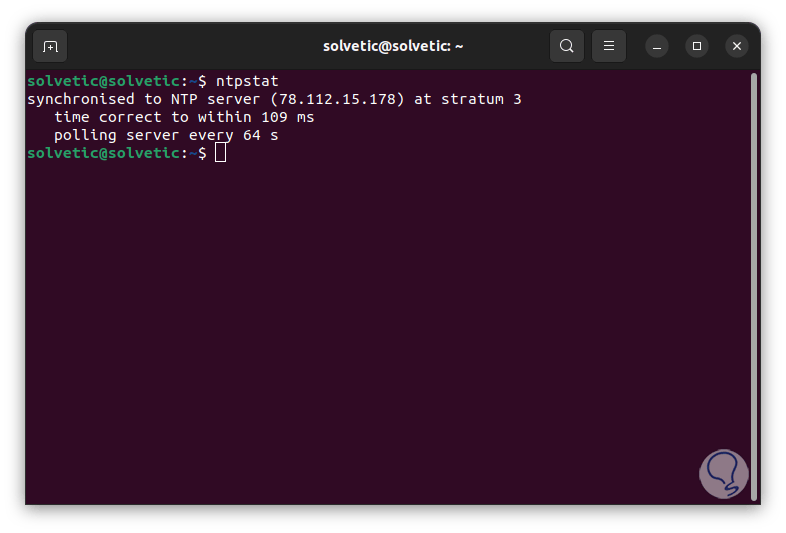 El comando ntpstat nos muestra el estado de sincronización de la hora de la red, allí encontramos con cual servidor se ha sincronizado (78.112.15.178) sobre que nivel (3), cuanto tardo la sincronización (109 ms) y cada cuanto se ejecuta el proceso (64 s).