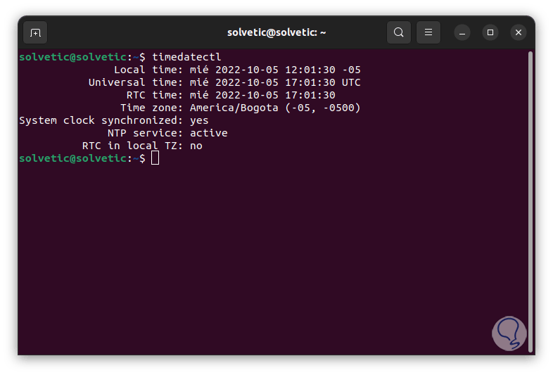 Lo primero será validar si nuestro sistema tiene la sincronización activa, abrimos la terminal y validamos el estado actual del tiempo: