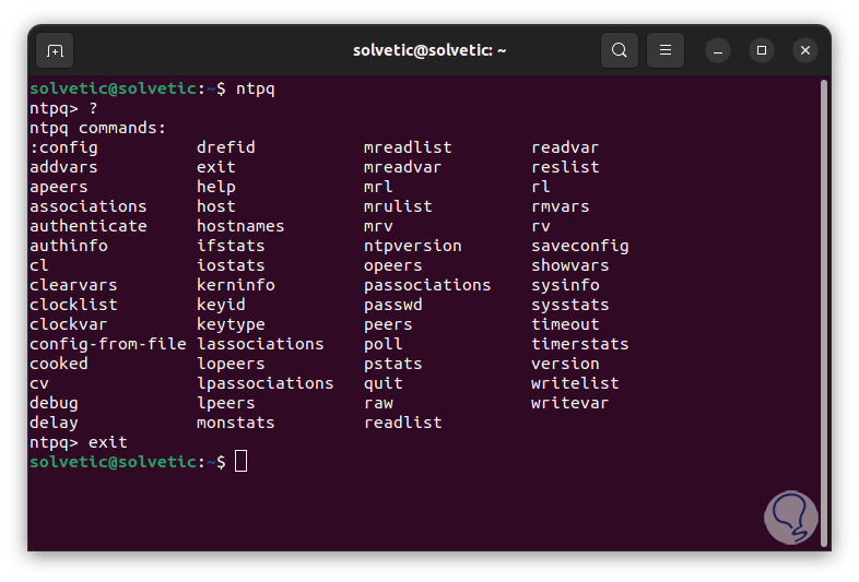 Podemos ejecutar "ntpq" para acceder a la consola y luego ingresar "?" para ver las diversas opciones: