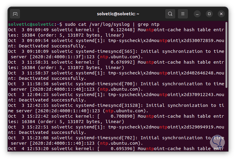 Hemos aplicado el filtro usando grep para que se muestren los resultados de ntp: