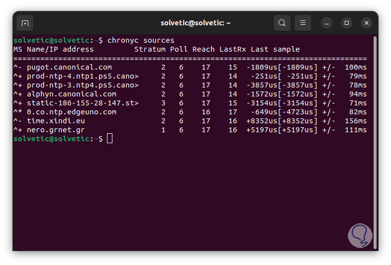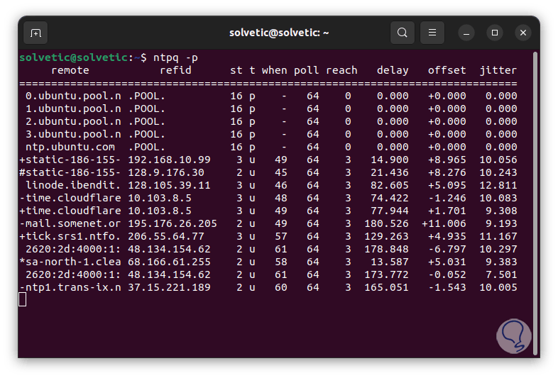 Ahora usaremos ntpq para listar los servidores de tiempo activos: