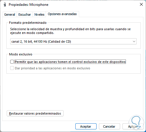 - Permitir que las aplicaciones tomen el control exclusivo de este dispositivo