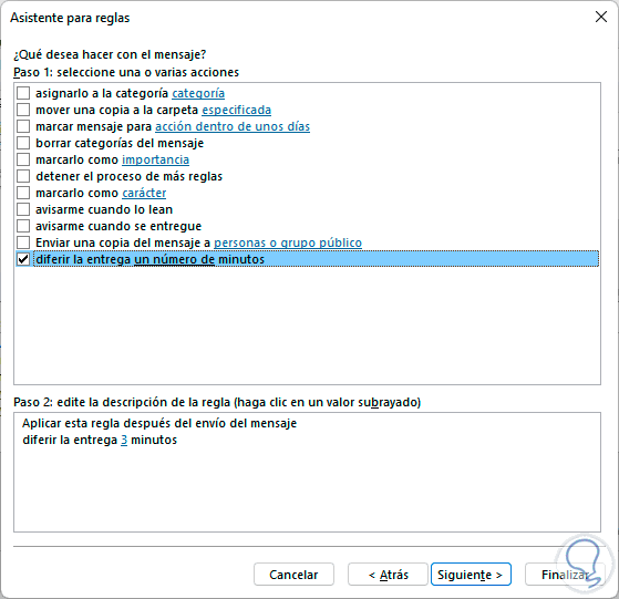 Ahora activamos la casilla "diferir la entrega un número de minutos":