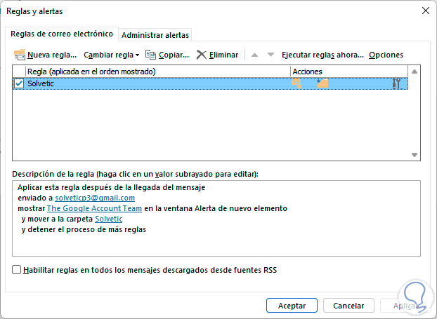 En la próxima ventana asignamos un nombre y activamos la casilla "Activar esta regla":