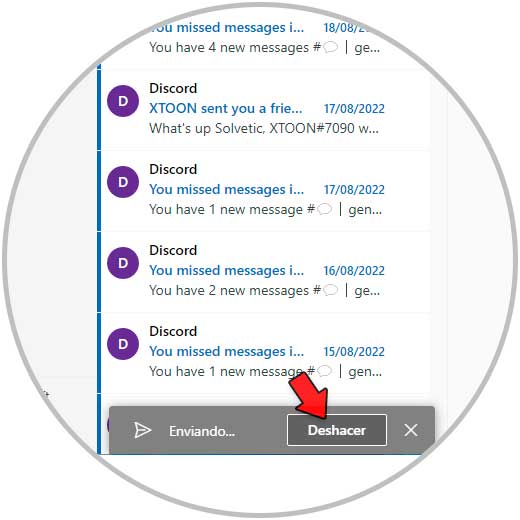 Al enviar un nuevo correo encontramos en la parte inferior la opción "Deshacer":