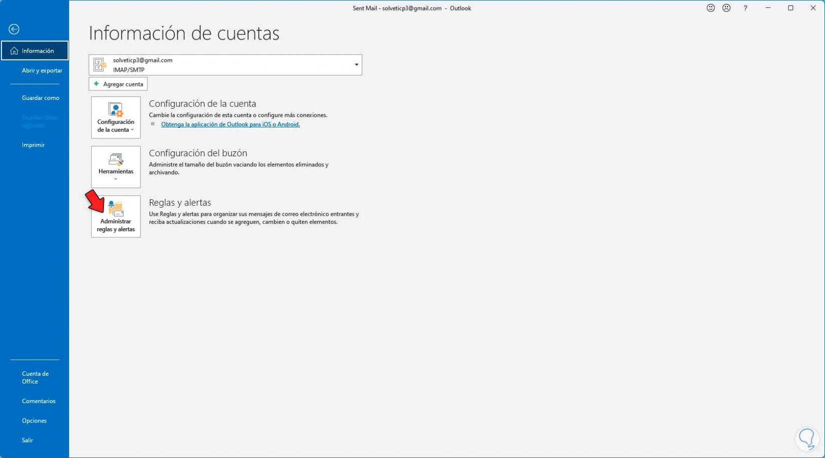 Es posible crear una regla para retrasar el envío de los correos, con ello es posible tener un tiempo, en minutos, para no enviar el correo o bien editar su contenido o destinatario si es el caso, para crear esta regla vamos a "Archivo - Administrar reglas y alertas":