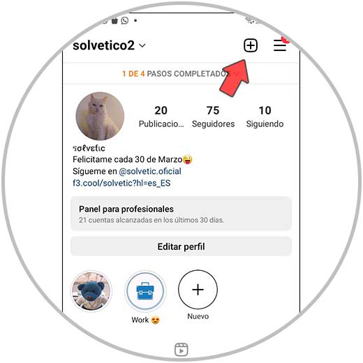 En tu perfil de Instagram, pulsa en el icono “+” en la esquina superior derecha.
