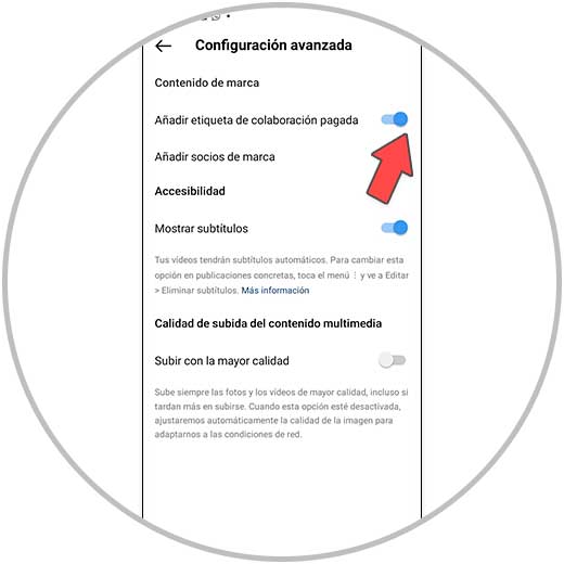 La pestaña de “Añadir etiqueta de colaboración pagada” debe estar activa.