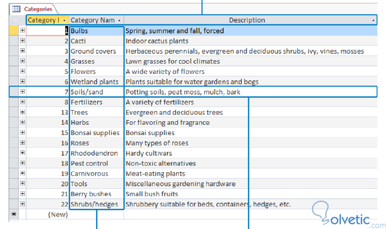 Los datos almacenados en Access 2013 son del tipo relacional, es decir, tienen una estructura que nos permite enlazar varias tablas a través de las llamadas llaves primarias, que no son más que valores únicos que representan a cada una de las filas o registros de la tabla, de esta forma si tenemos una categoría de productos, en la tabla de productos no tenemos que colocar el nombre completo de la categoría, si no que utilizamos su llave primaria, ahorrando así espacio.