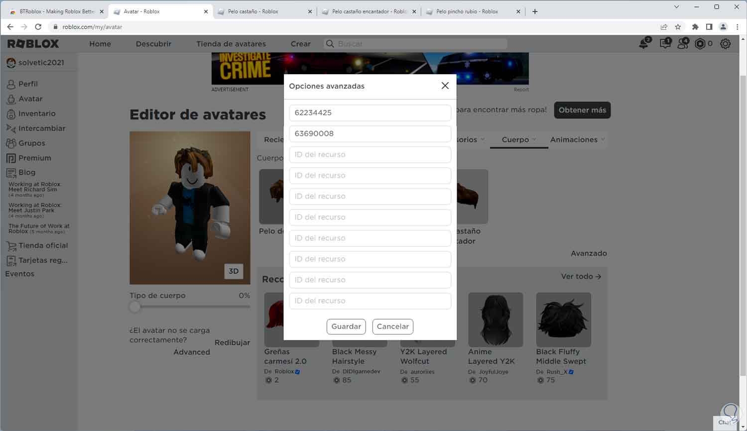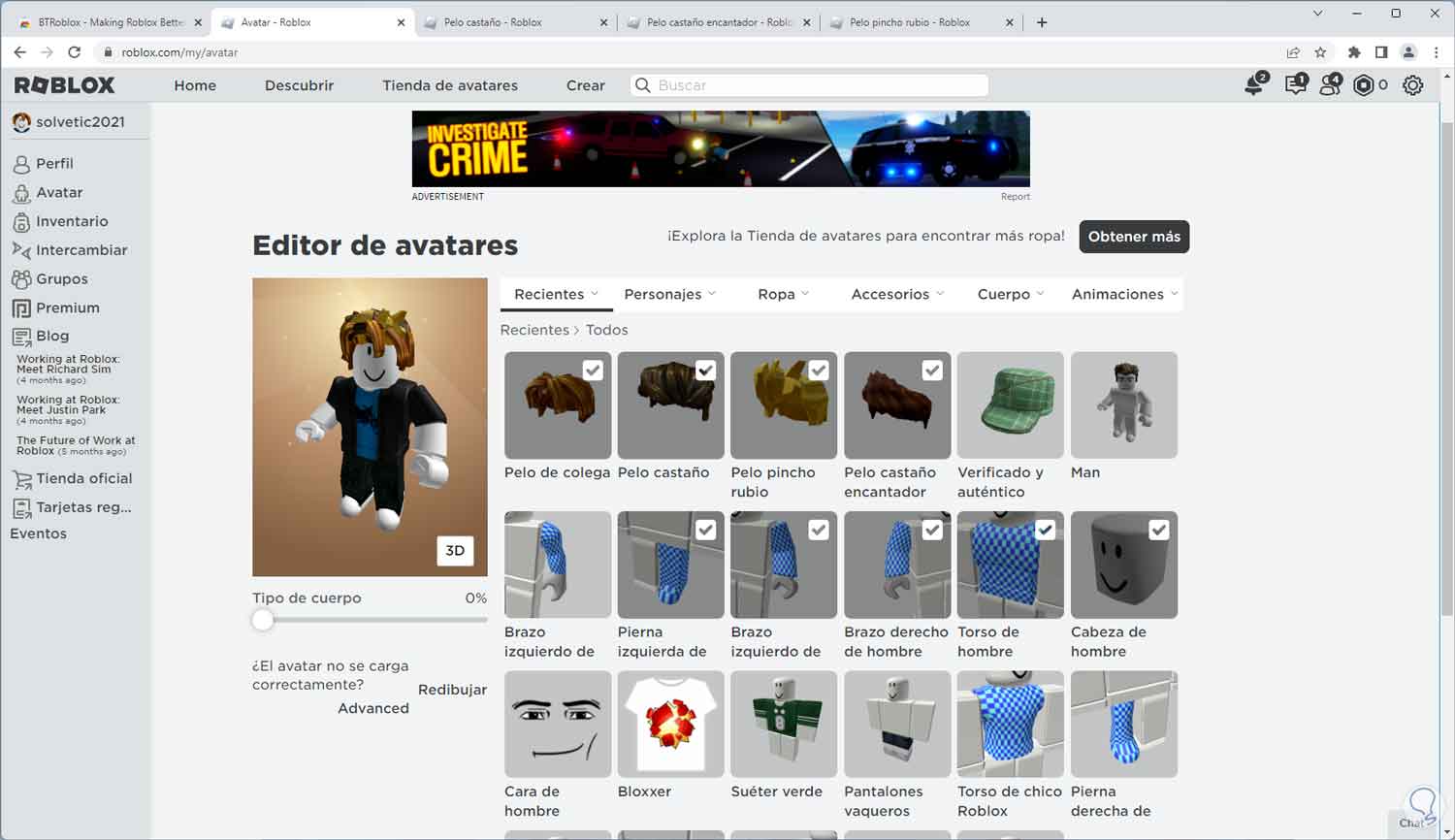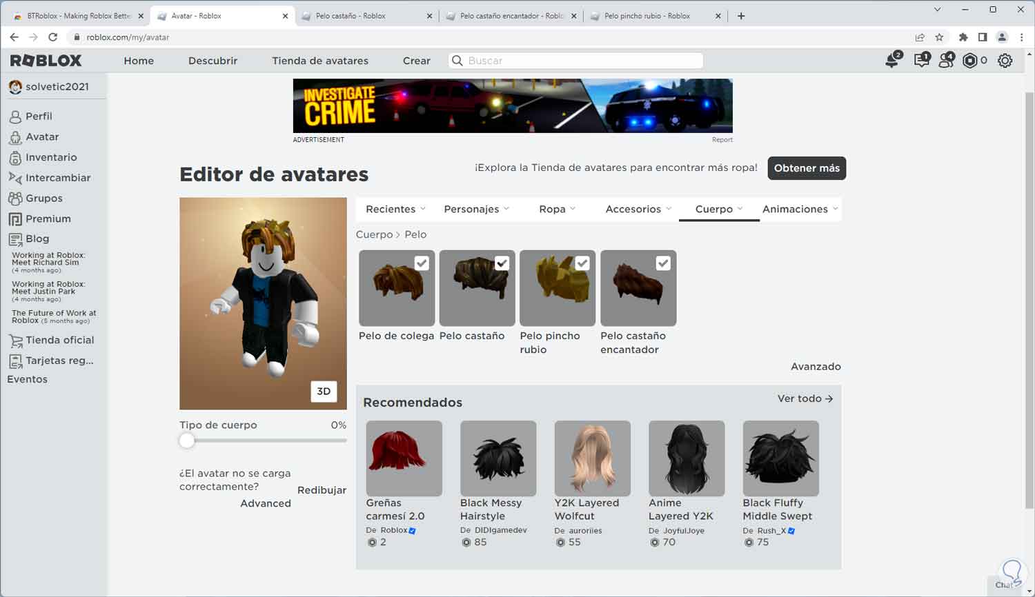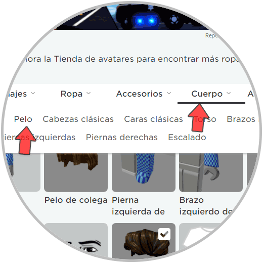 Repetimos esto para cada cabello a usar en el avatar de Roblox. Ahora en Roblox damos clic en "Cuerpo - Pelo":
