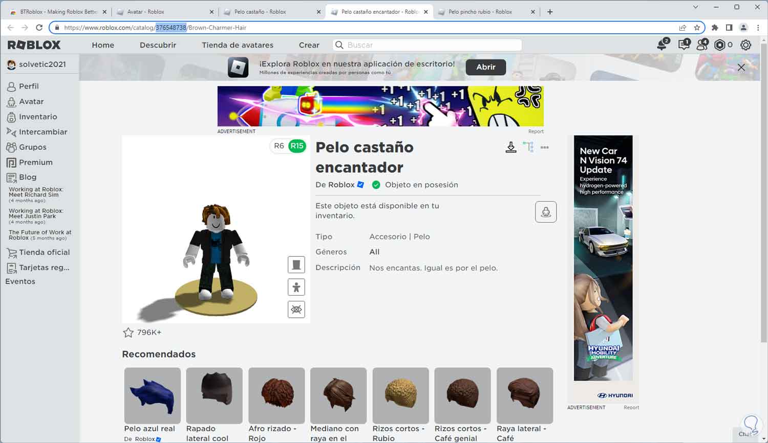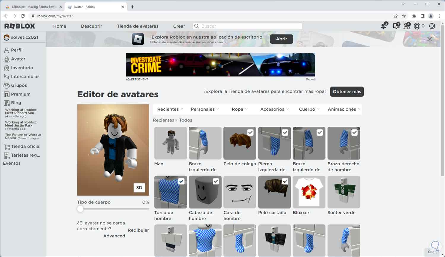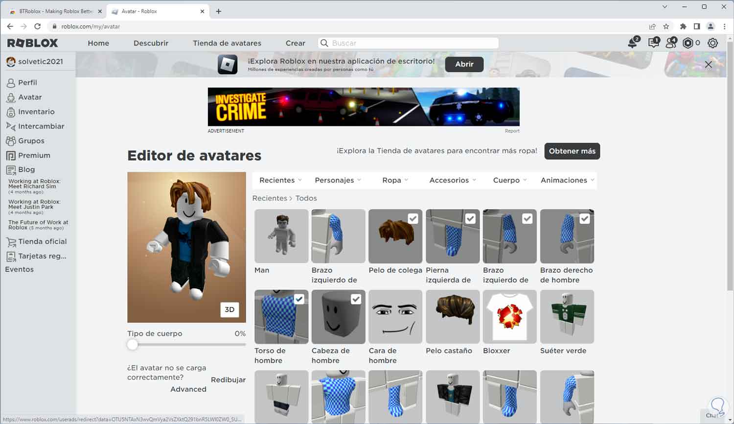 Repetimos esto para cada cabello a usar en el avatar de Roblox. Ahora en Roblox damos clic en "Cuerpo - Pelo":