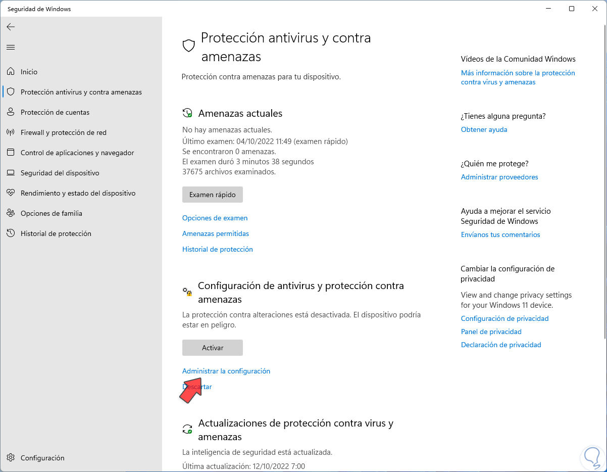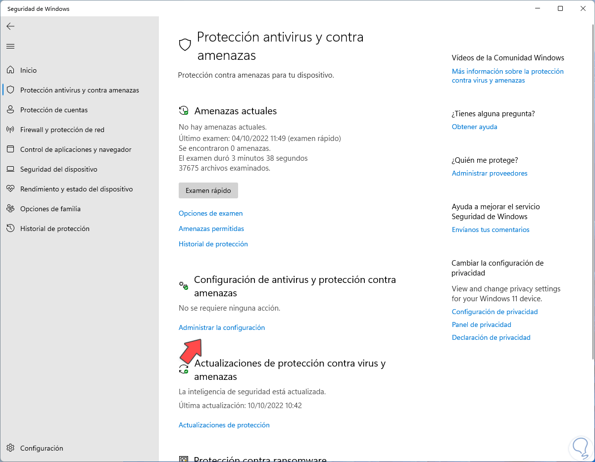 En "Protección antivirus y contra amenazas" damos clic en "Administrar la configuración":