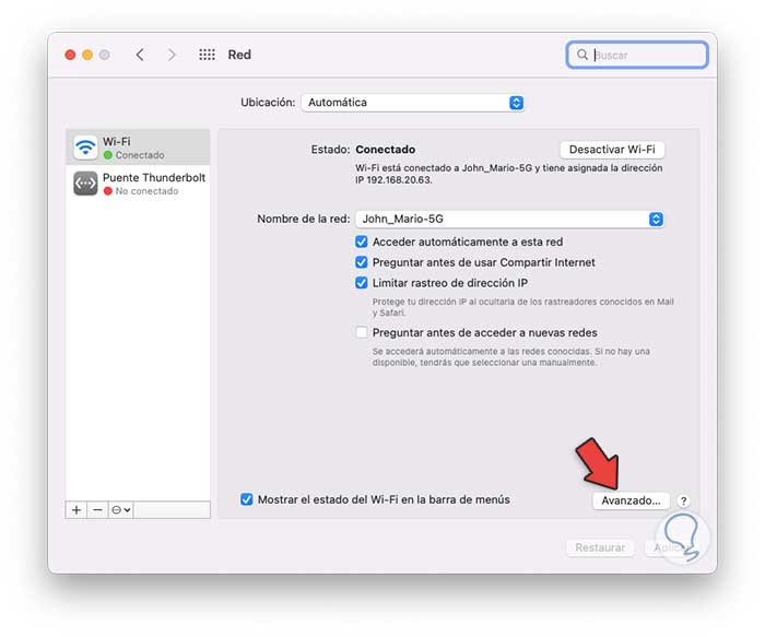 Damos clic en "Avanzado" y en “Wi-Fi” seleccionamos la red: