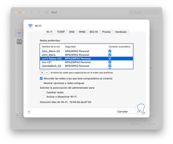 En caso de ver una red diferente es posible desactivar su casilla para conectarse automáticamente o bien dar clic en el signo - para eliminarla: