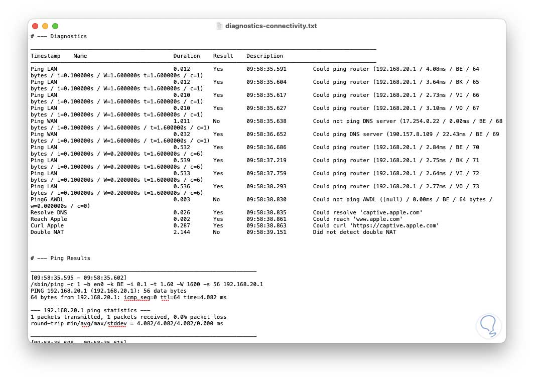 Allí encontramos una serie de archivos de texto con los detalles de red los cuales son claves para el administrador con el fin de analizarlos y determinar donde está la falla, abrimos alguno de los resultados creados para ver detalles: