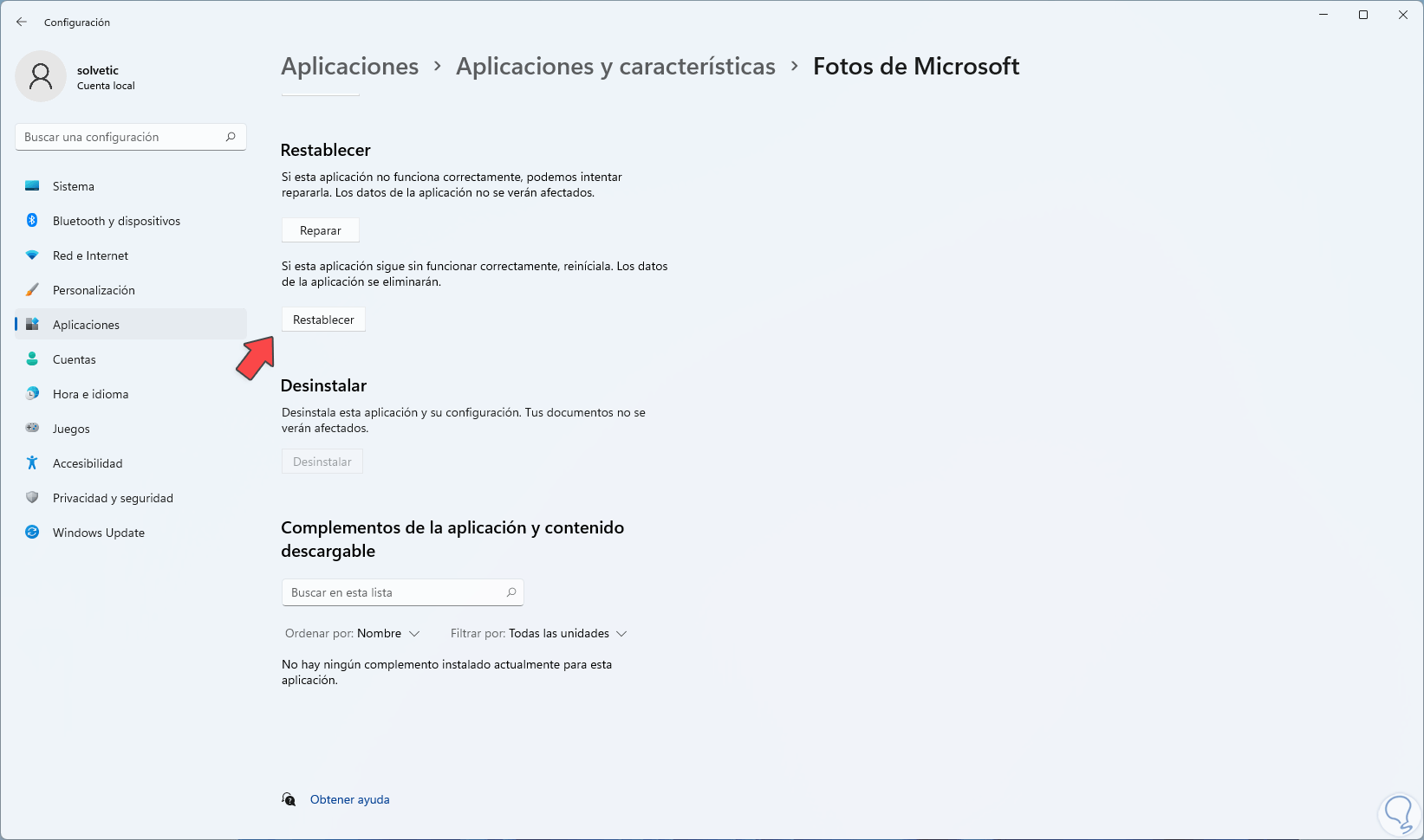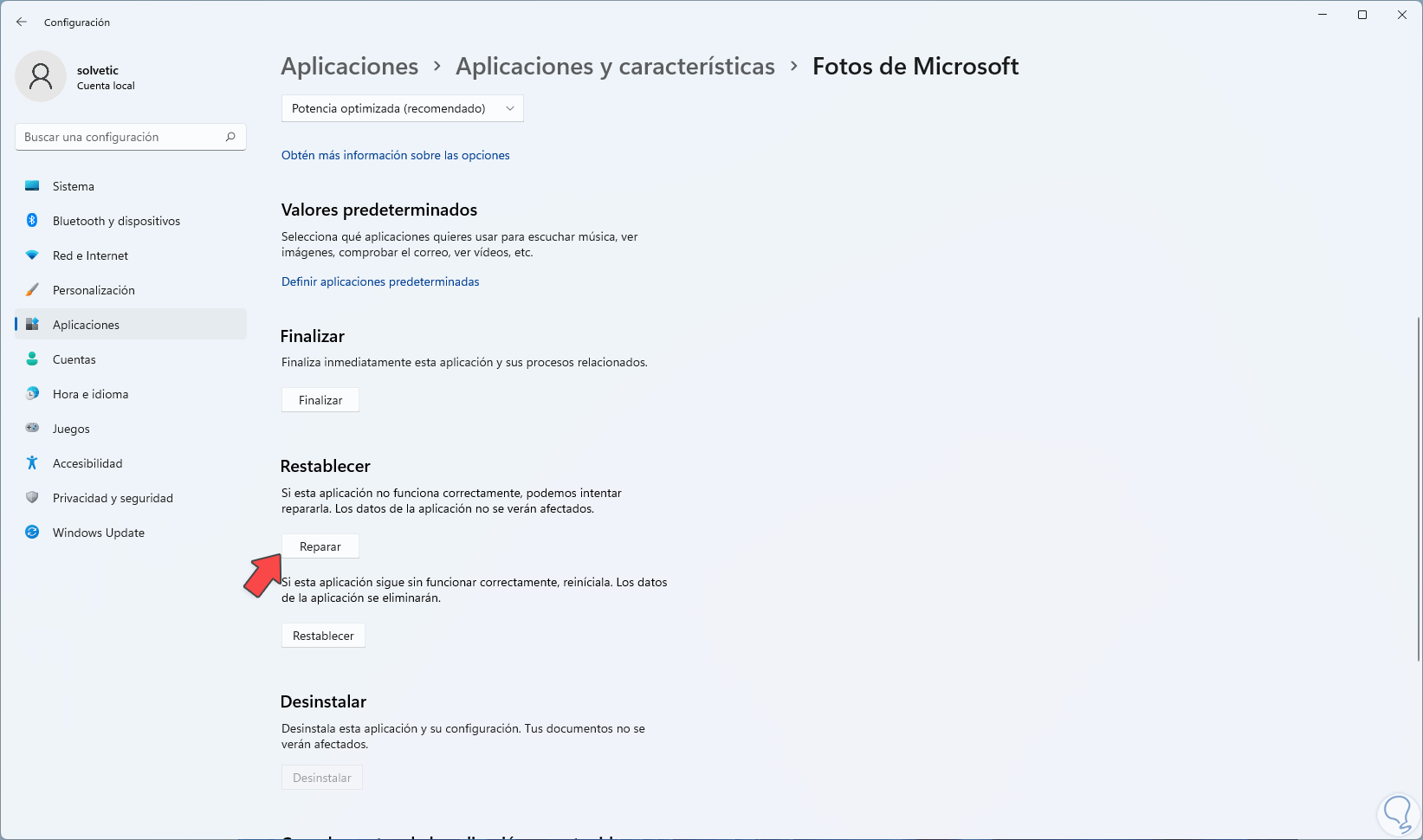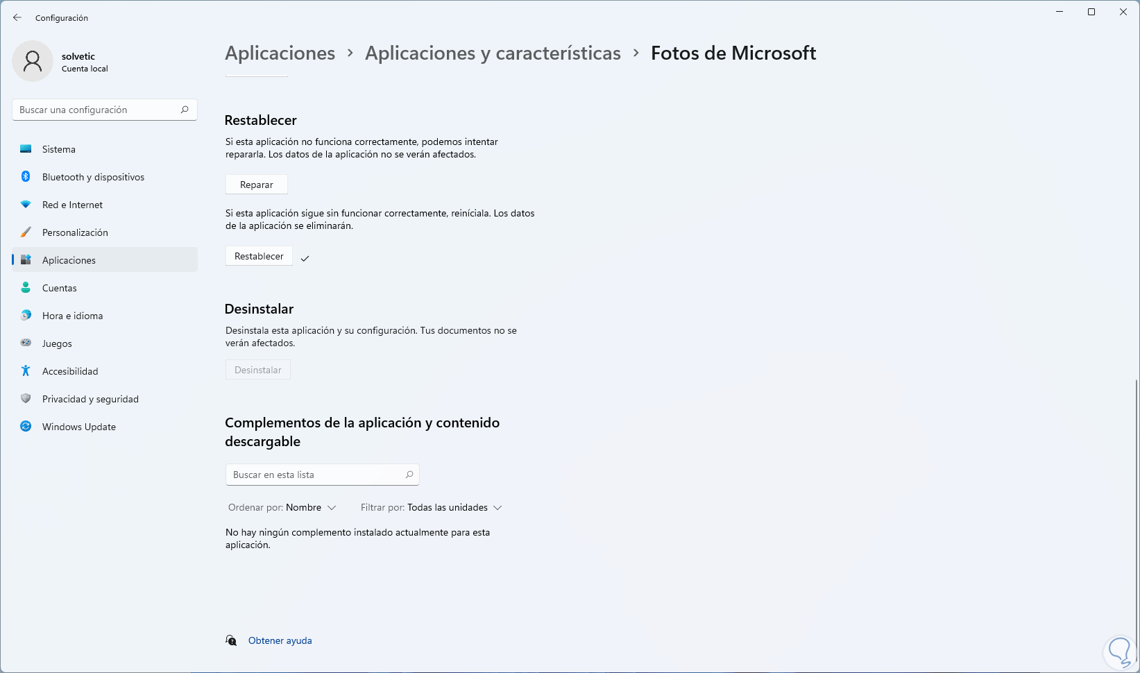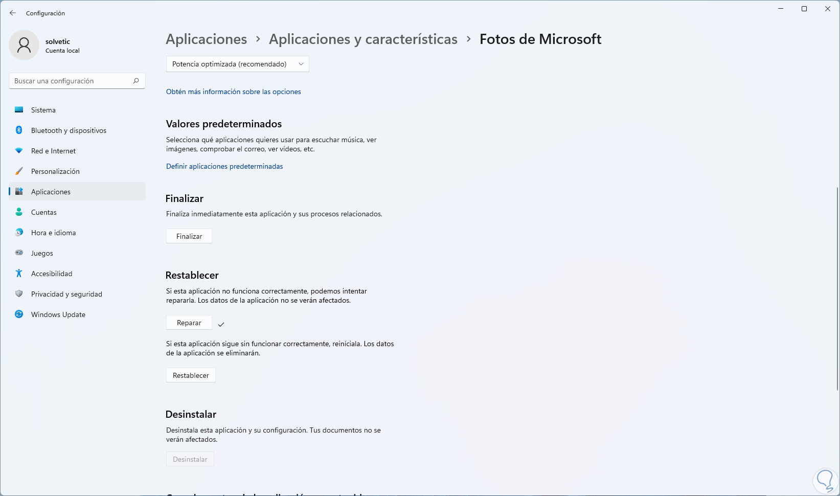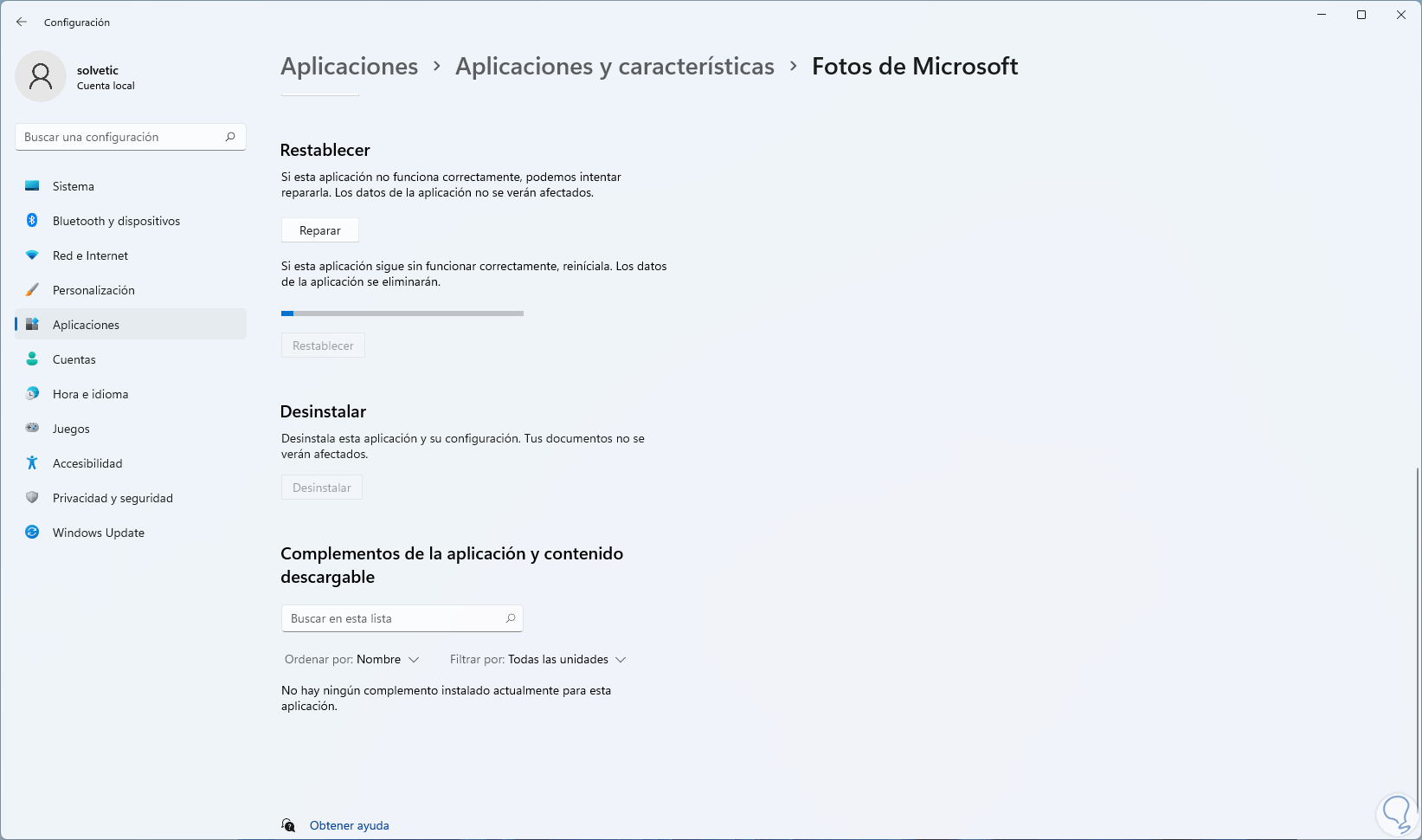 Al dar clic allí se dará paso al restablecimiento de la aplicación Fotos en Windows 11: