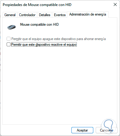 En la ventana emergente vamos a la pestaña "Administración de energía". Desactivamos la casilla "Permitir que este dispositivo reactive el equipo":