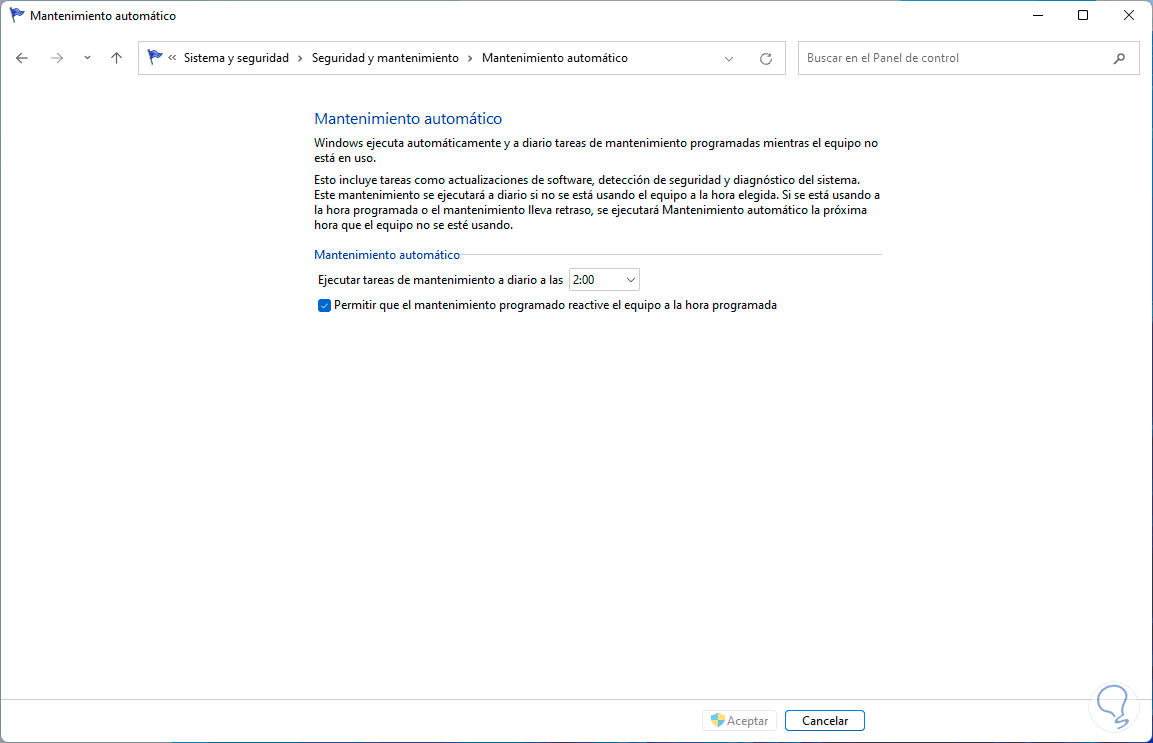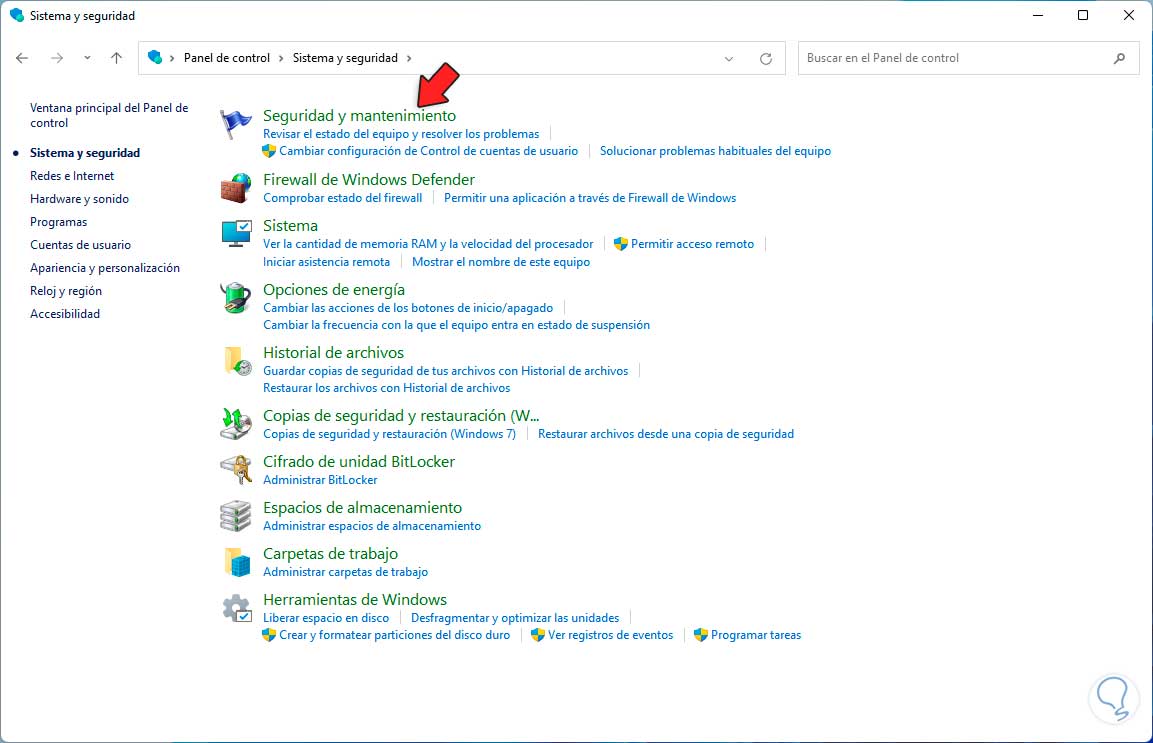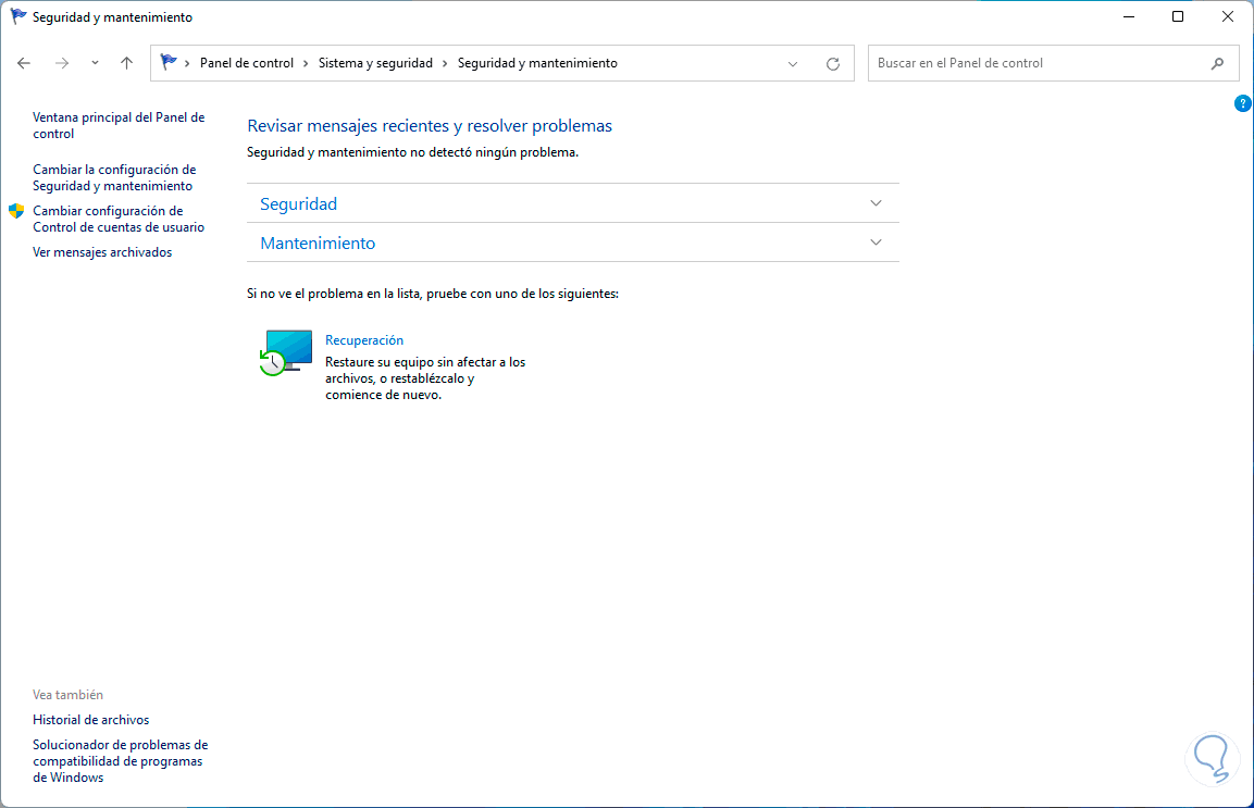 Damos clic en “Seguridad y mantenimiento” y se tendrá acceso a lo siguiente: