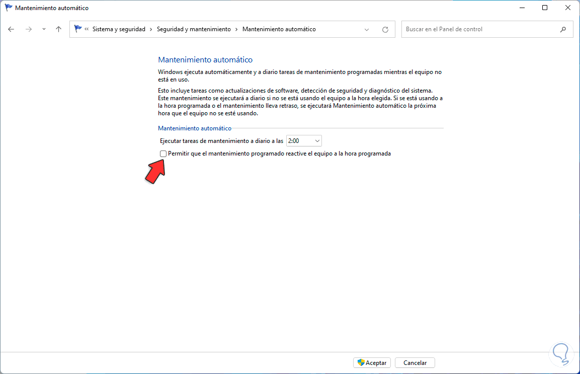 Desactivamos la casilla "Permitir que el mantenimiento programado reactive el equipo a la hora programada":