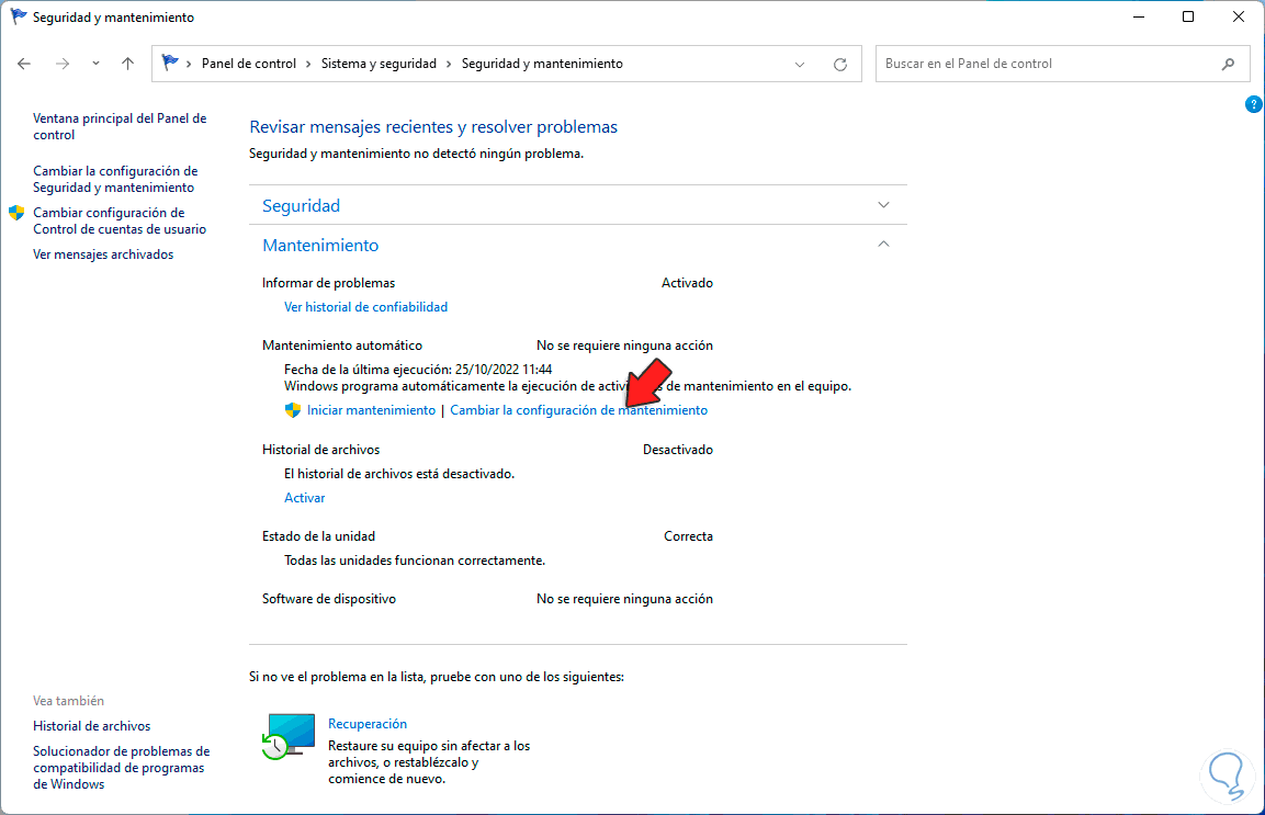 Ahora desplegamos "Mantenimiento" y damos clic en "Cambiar la configuración de mantenimiento":
